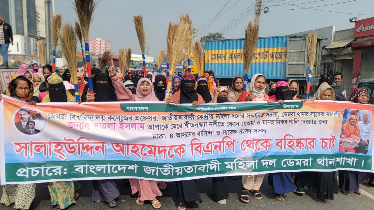 রাজধানীর ডেমরায় বিএনপির সাবেক এমপি আলহাজ সালাউদ্দিন আহমেদকে দল থেকে বহিষ্কারের দাবিতে ঝাড়ু মিছিল করেছেন বাংলাদেশ জাতীয়তাবাদী মহিলা দলের নেতাকর্মীরা।