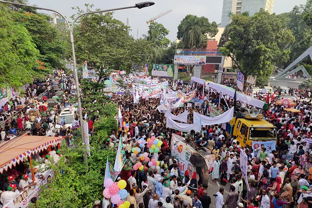 বাংলাদেশ আওয়ামী লীগের ৭৫তম প্রতিষ্ঠাবার্ষিকী ২৩ জুন। এ উপলক্ষে আজ শুক্রবার আয়োজন করা হয়েছে আনন্দ শোভাযাত্রার। বেলা আড়াইটা থেকেই নেতা-কর্মীরা মিছিল নিয়ে আসছেন। ইঞ্জিনিয়ার্স ইনস্টিটিউশন বাংলাদেশের সামনে ট্রাকের ওপর বানানো হয়েছে মঞ্চ। কেন্দ্রীয় নেতারা বক্তৃতা দিচ্ছেন।