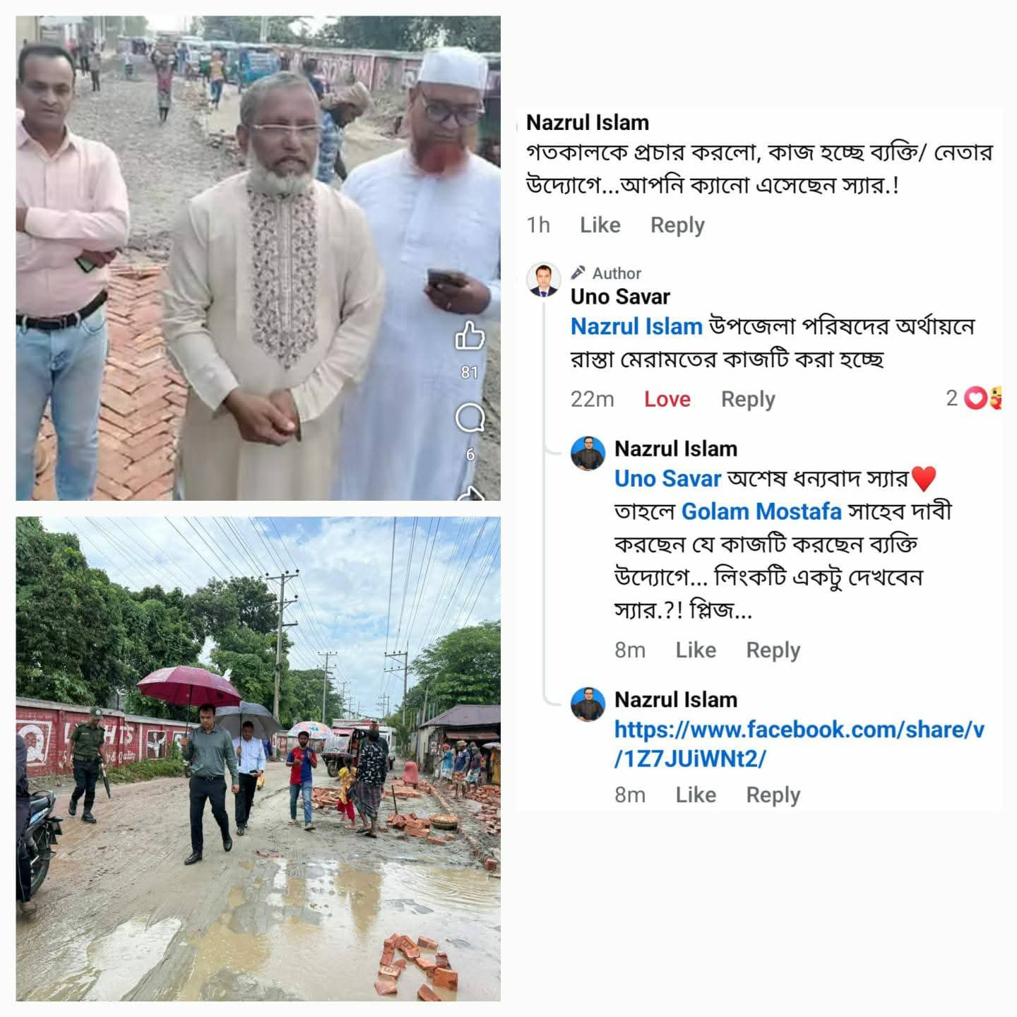 আজ ২৬ জুন একই রাস্তার একই কাজ পরিদর্শনে যান সাভার উপজেলা নির্বাহী অফিসার জনাব আবু বকর সরকার। তিনি উন্নয়ন কাজের তদারকি করেন এবং সাভার ইউনো প্রোফাইলে পোষ্ট করেন। উল্লেখিত পোষ্টের কমেন্টেসে এই প্রতিবেদক প্রশ্ন করলে ইউনো জানান যে এই কাজ হচ্ছে সাভার উপজেলার অর্থায়নে। তাহলে জনমনে প্রশ্ন দেখা দিয়েছে যে, উল্লেখিত রাস্তাটির অর্থায়ন আসলে কে করছেন.? সাভার উপজেলা পরিষদ নাকি বিএনপি নেতা গোলাম মোস্তফা.?