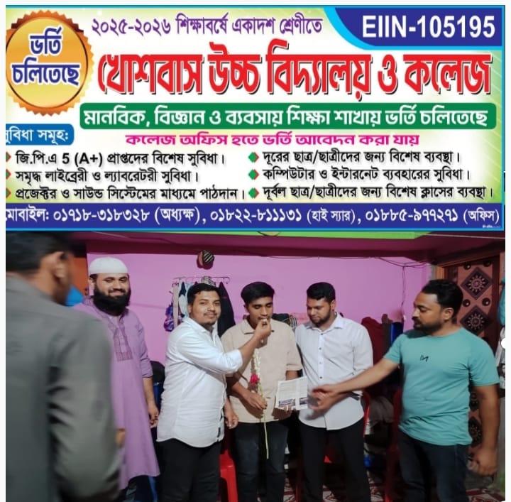 অন্যদিকে, খোশবাস উচ্চ বিদ্যালয় ও কলেজ কর্তৃপক্ষ এসএসসি পরীক্ষা ২০২৫-এ উত্তীর্ণ সকল শিক্ষার্থীকে আন্তরিক শুভেচ্ছা, অভিনন্দন ও স্বাগত জানিয়েছে।