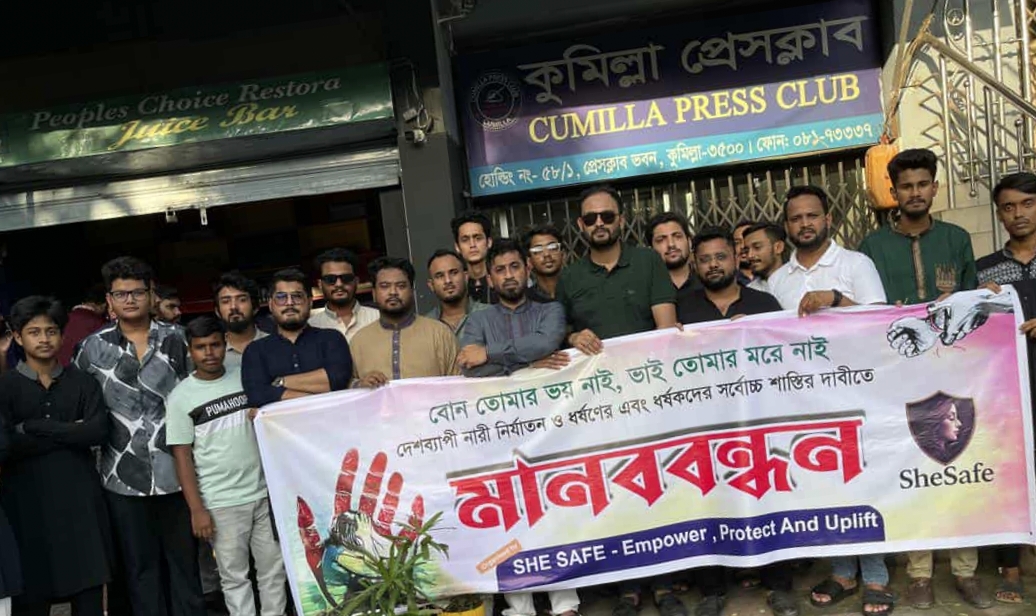 আজ ১১ জুলাই ২৫ রোজ শুক্রবার কুমিল্লা প্রেসক্লাবের সামনে এ মানববন্ধন অনুষ্ঠান অনুষ্ঠিত হয়