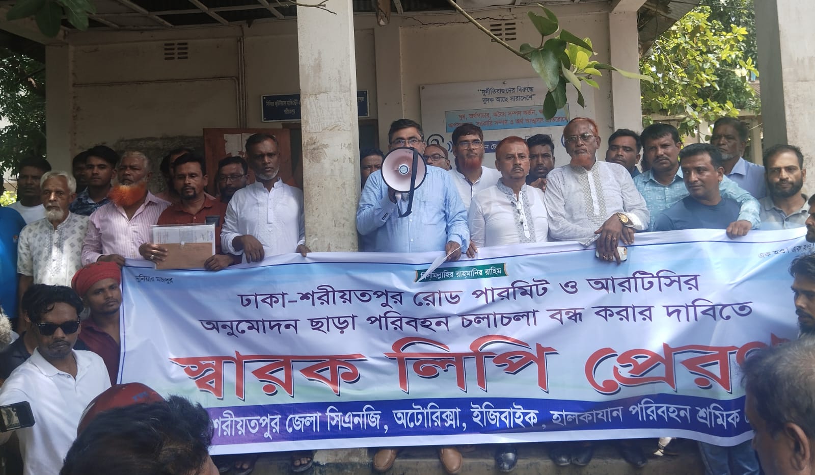 আন্তজেলা রুট পারমিট ও আরটিসির অনুমোদন ব্যতিত বাস জেলার বিভিন্ন উপজেলায় চলাচল বন্ধ ও সিএনজির রেজিষ্ট্রেশন পাওয়ার দাবীতে বিক্ষোভ মিছিল ও জেলা প্রশাসক বরাবর স্মারকলিপি প্রদান করেছে শরীয়তপুর জেলা সিএনজি, অটোরিকশা, হালকাযান পরিবহন শ্রমিক ফেডারেশন।