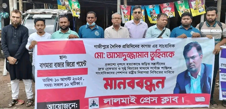 গাজীপুরে দৈনিক প্রতিদিনের কাগজ এর সাংবাদিক আসাদুজ্জামান তুহিন কে প্রকাশ্যে হ*ত্যার প্রতিবাদে লালমাই প্রেস ক্লাবের মা*নবব*ন্ধন।