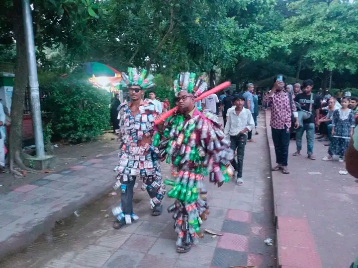 ককুমিল্লা দু তরুণ শরীরে প্লাস্টিকের বোতল, সিগারেটের প্যাকেট ও নানা বর্জ্য দিয়ে তৈরি পোশাক পরে তারা ঘুরে বেড়াচ্ছেন শহরের নানা প্রান্তে।