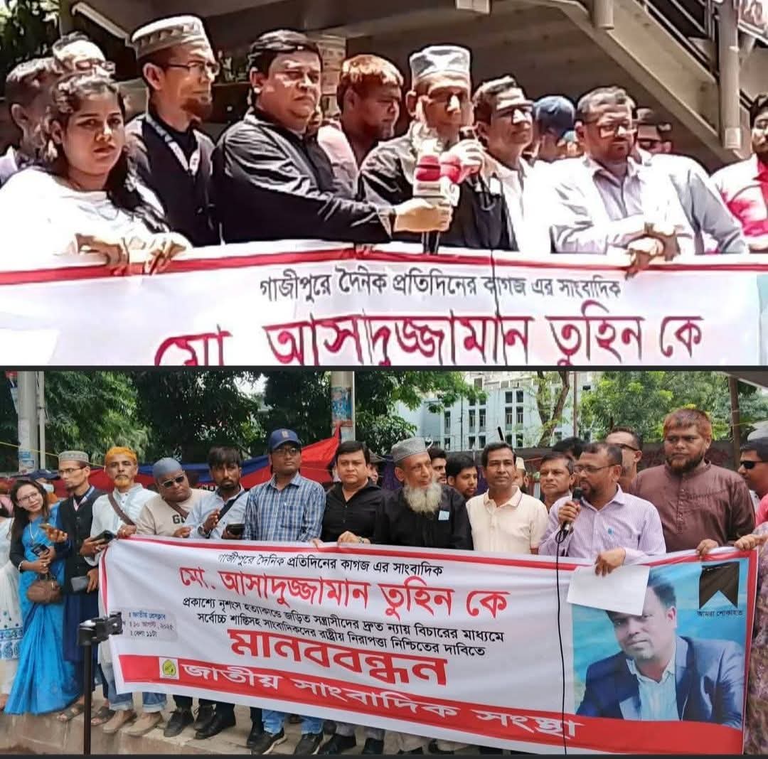 গাজীপুরে দুর্বৃত্তদের হাতে নির্মমভাবে হত্যা হয়েছে দৈনিক প্রতিদিন পত্রিকার সাংবাদিক আসাদুজ্জামান তুহিন (৩৮)। এই নৃশংস হত্যাকাণ্ড শুধু সাংবাদিক সমাজ নয়, মুক্ত গণমাধ্যম ও মত প্রকাশের স্বাধীনতার ওপরও এক ভয়াবহ আঘাত হিসেবে দেখা হচ্ছে। এই ঘটনার প্রতিবাদে ও হত্যাকারীদের দ্রুত দৃষ্টান্তমূলক শাস্তির দাবিতে রবিবার বেলা ১১টায় জাতীয় প্রেসক্লাবের সামনে জাতীয় সাংবাদিক সংস্থার উদ্যোগে এক প্রতিবাদ সভা ও মানববন্ধন অনুষ্ঠিত হয়।