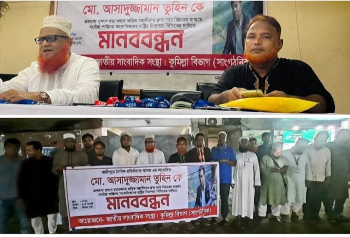গাজীপুরে দৈনিক প্রতিদিনের কাগজ পএিকার রিপোর্টার সাংবাদিক আসাদুজ্জামান খান তুহিন কে জ*বাই করে হত্যার ঘটনায় জাতীয় সাংবাদিক সংস্থা কুমিল্লা সাংগঠনিক বিভাগের পক্ষ থেকে মানববন্ধনের আয়োজণ করা হয়। এতে উপস্থিত ছিলেন বিভাগীয় সভাপতি মোঃ হারিসুর রহমান ও প্রধান উপদেষ্ঠা অধ্যক্ষ শফিকুল আলম হেলাল স্যার সহ স্থানীয় সাংবাদিক নেতৃবৃন্দ প্রমূখ উপস্থিত ছিলেন । এ সময় প্রতিবাদ বক্তব্যে তিনি বলেন খুনীদেরকে দ্রুত বিচারের আওতায় এনে সর্বোচ্ছ শাস্তি মৃত্যুদন্ড দেওয়ার জন্য জোড় দাবি জানান।