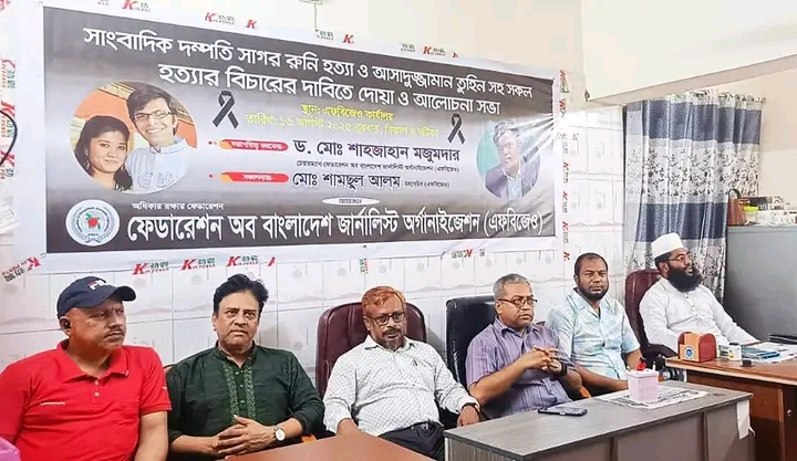 ঢাকায় ১৩ আগস্ট (বুধবার) ফেডারেশন অব বাংলাদেশ জার্নালিষ্ট অর্গানাইজেশন (এফবিজেও) আয়োজনে দম্পতি সাংবাদিক সাগর সরওয়ার ও মেহেরুন রুনি হত্যা মামলা এবং সাম্প্রতিক সাংবাদিক আসাদুজ্জামান তুহিনসহ সকল হত্যার দ্রুত বিচার দাবিতে দোয়া ও আলোচনা সভা অনুষ্ঠিত হয়েছে।