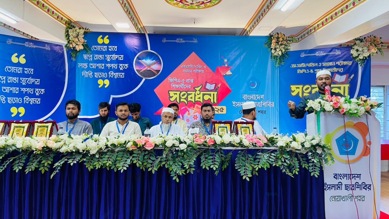 এসএসসি, দাখিল ও সমমান পরীক্ষায় জিপিএ-৫ প্রাপ্ত শিক্ষার্থীদের সংবর্ধনা দিয়েছে ইসলামী ছাত্রশিবির নোয়াখালী শহর শাখা। মঙ্গলবার সকাল ১০টায় হোয়াইট হল পার্টি সেন্টারে প্রায় তিন শতাধিক শিক্ষার্থী নিয়ে ছাত্রশিবির এ সংবর্ধনার আয়োজন করে।