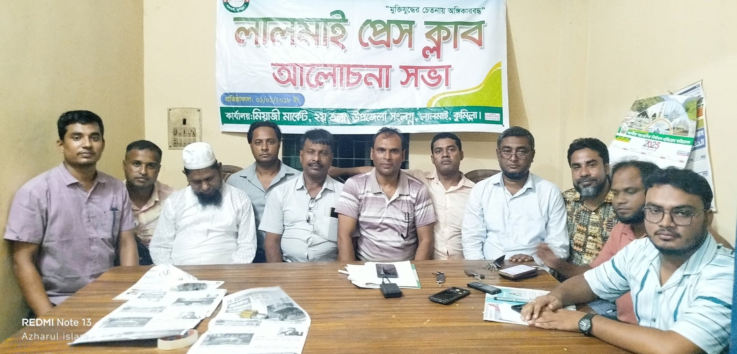 ২৫ সেপ্টেম্বর, ২০২৫ বৃহস্পতিবার বিকেল ৫ টায় লালমাই উপজেলা পরিষদ সংলগ্ন থানা রোড খন্দকার মার্কেটে লালমাই প্রেস ক্লাবের কার্যালয়ে মাসিক আলোচনা সভা অনুষ্ঠিত হয়।