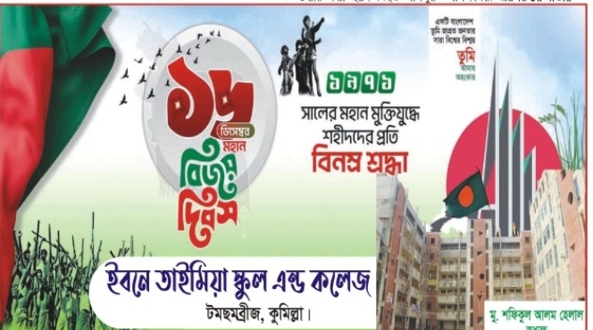 ঐতিহ্য বাহি শিক্ষা প্রতিষ্ঠান কুমিল্লা ইবনে তাই মিয়া স্কুল এন্ড কলেজ ১৬ ই ডিসেম্বর ২০২৪ বিভিন্ন কর্মসূচির মাধ্যমে মহান বিজয় দিবস উদযাপন করা হয়। মহান মুক্তিযুদ্ধে ও ২০২৪ সালে দেশের জন্য যারা জীবন দিয়ে শাহাদাৎ বরণ করেছেন তাদের রুহের মাগফেরাত কামনায় দোয়া অনুষ্ঠানের ও আয়োজন করা হয়।