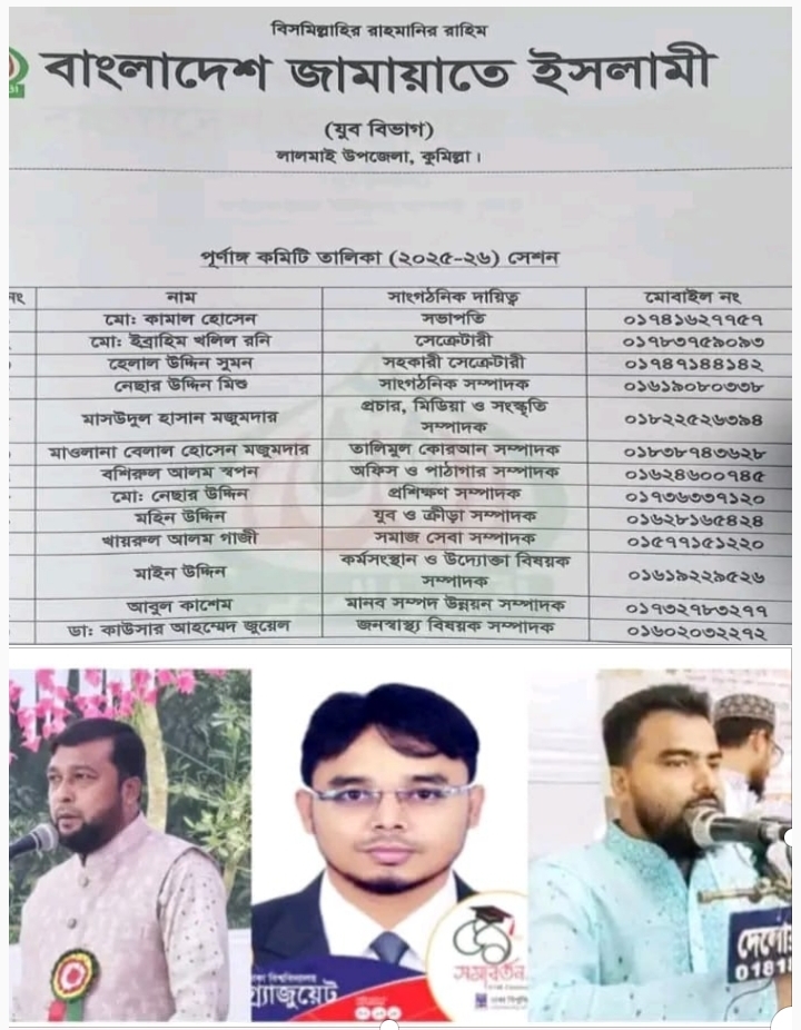বাংলাদেশ জামায়াতে ইসলামী লালমাই উপজেলা যুব বিভাগের ২০২৫-২৬ সেশনের কমিটি গঠন সম্পন্ন।