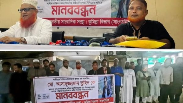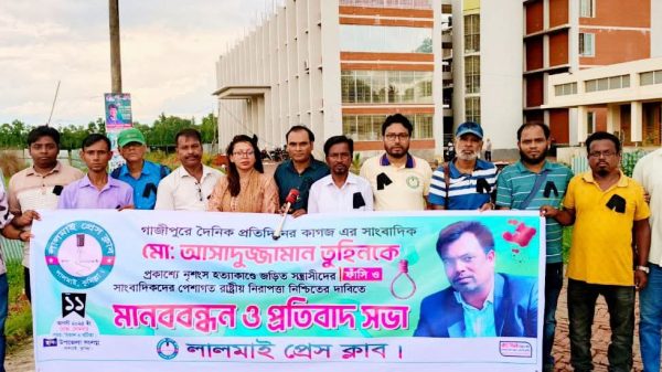 সাংবাদিক তুহিন হত্যার প্রতিবাদে লালমাই প্রেসক্লাবের মানববন্ধন মুহাম্মদ আহসান উল্যাহ (কুমিল্লা) গাজীপুরে দৈনিক প্রতিদিনের কাগজ এর সাংবাদিক মো: আসাদুজ্জামান তুহিনকে প্রকাশ্যে নৃশংস হত্যাকাণ্ডে জড়িত সন্ত্রাসীদের ফাঁসি ও সাংবাদিকদের পেশাগত রাষ্ট্রীয়