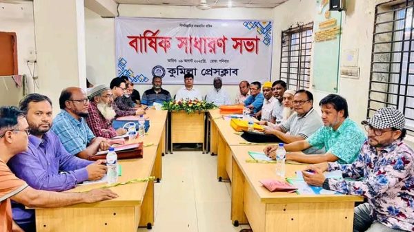 কুমিল্লা প্রেসক্লাবের বার্ষিক সাধারণ সভা-২০২৫ অনুষ্ঠিত। ওমর ফারুকী তাপস।।(কুমিল্লা) কুমিল্রা প্রেসক্লাবের বার্ষিক সাধারণ সভা ২০২৫ গত ৯ আগষ্ট কুমিল্লা প্রেসক্লাব মিলনায়তনে অনুষ্ঠিত হয়েছে। সভায় সভাপতিত্ব করেন কুমিল্লা প্রেসক্লাবের সভাপতি কাজী