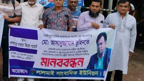 গাজীপুরে দৈনিক প্রতিদিনের কাগজ এর সাংবাদিক আসাদুজ্জামান তুহিন কে প্রকাশ্যে হত্যার প্রতিবাদে,১০ আগষ্ট রবিবার সকাল ১০ ঘটিকায় বাগমারা জিরো পয়েন্টে লালমাই সাংবাদিক ইউনিয়ন এর মানববন্ধন। এসময় উপস্থিত ছিলেন, লালমাই প্রেস