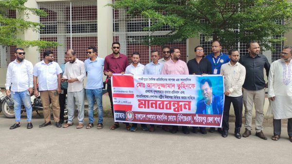 সাংবাদিক তুহিন হত্যাকারীদের দৃষ্টান্তমূলক শাস্তি দাবিতে শরীয়তপুরে মানববন্ধন শরীয়তপুর প্রতিনিধি: গাজীপুরে সাংবাদিক আসাদুজ্জামান তুহিনকে প্রকাশ্যে কুপিয়ে হত্যার প্রতিবাদে শরীয়তপুরে মানববন্ধন করেছেন সাংবাদিকেরা। রবিবার (১০ আগস্ট) সকাল ১০টার দিকে জেলা প্রশাসক